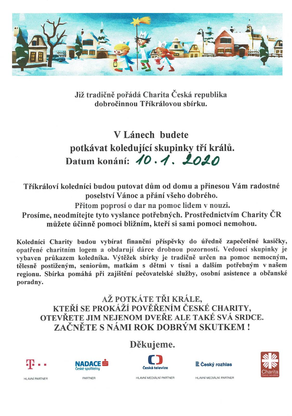 Tříkrálová sbírka proběhne v naší obci v pátek 10. ledna od 16 hodin. Akci pořádá Charita Česká republika, v Lánech spolupracuje s Dětským oddílem Berušky.